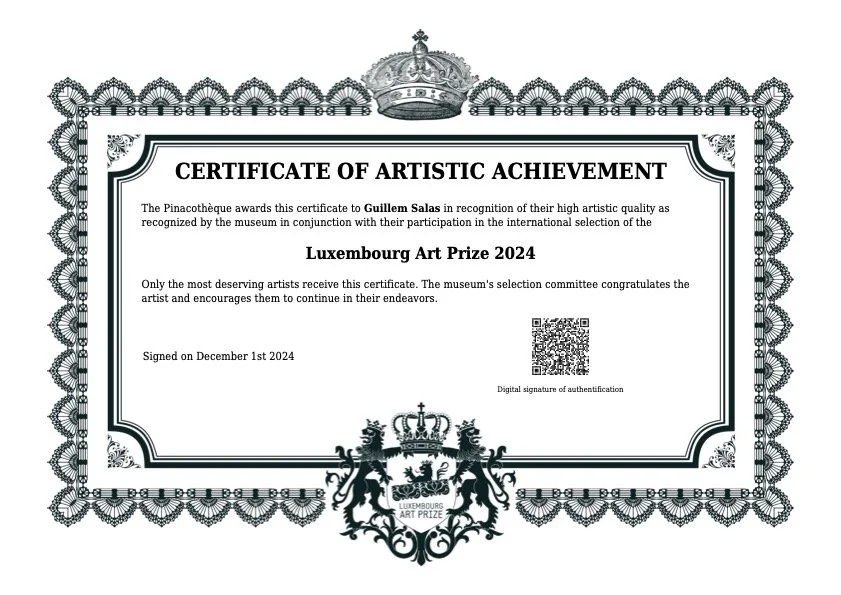 Certificado de mérito artístico de la Pinacotheque de Luxemburgo 2024.