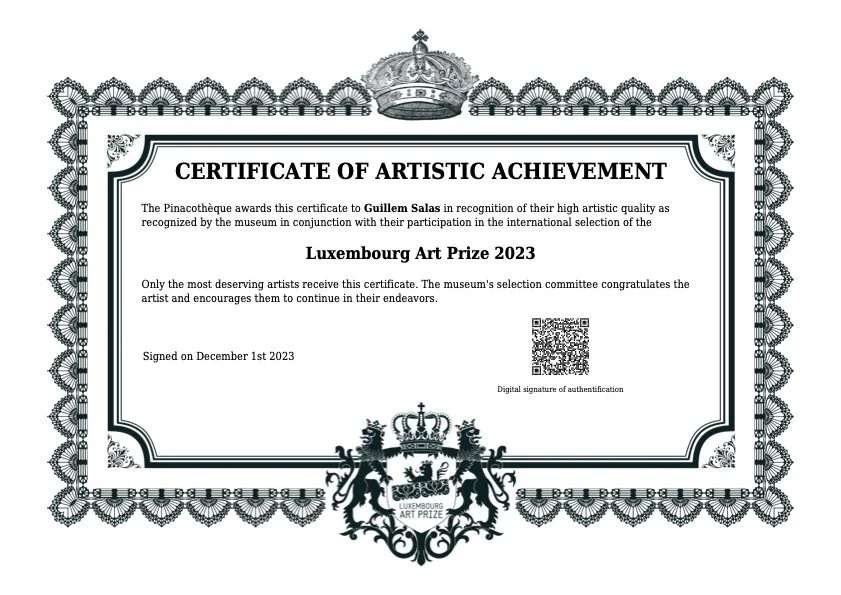 Certificado de mérito artístico de la Pinacotheque de Luxemburgo 2023.